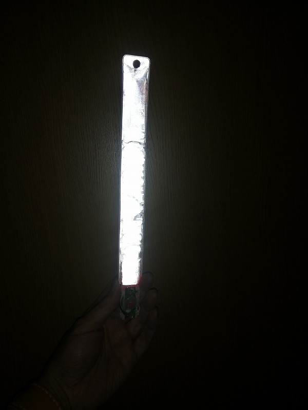 100均の暗いLEDライトでも正面から見ると眩しいので緊急事態でつける場合は下向きにしてゆっくり走行しましょう。(100均の物では街灯の無い所は歩く速さしか出せません。)