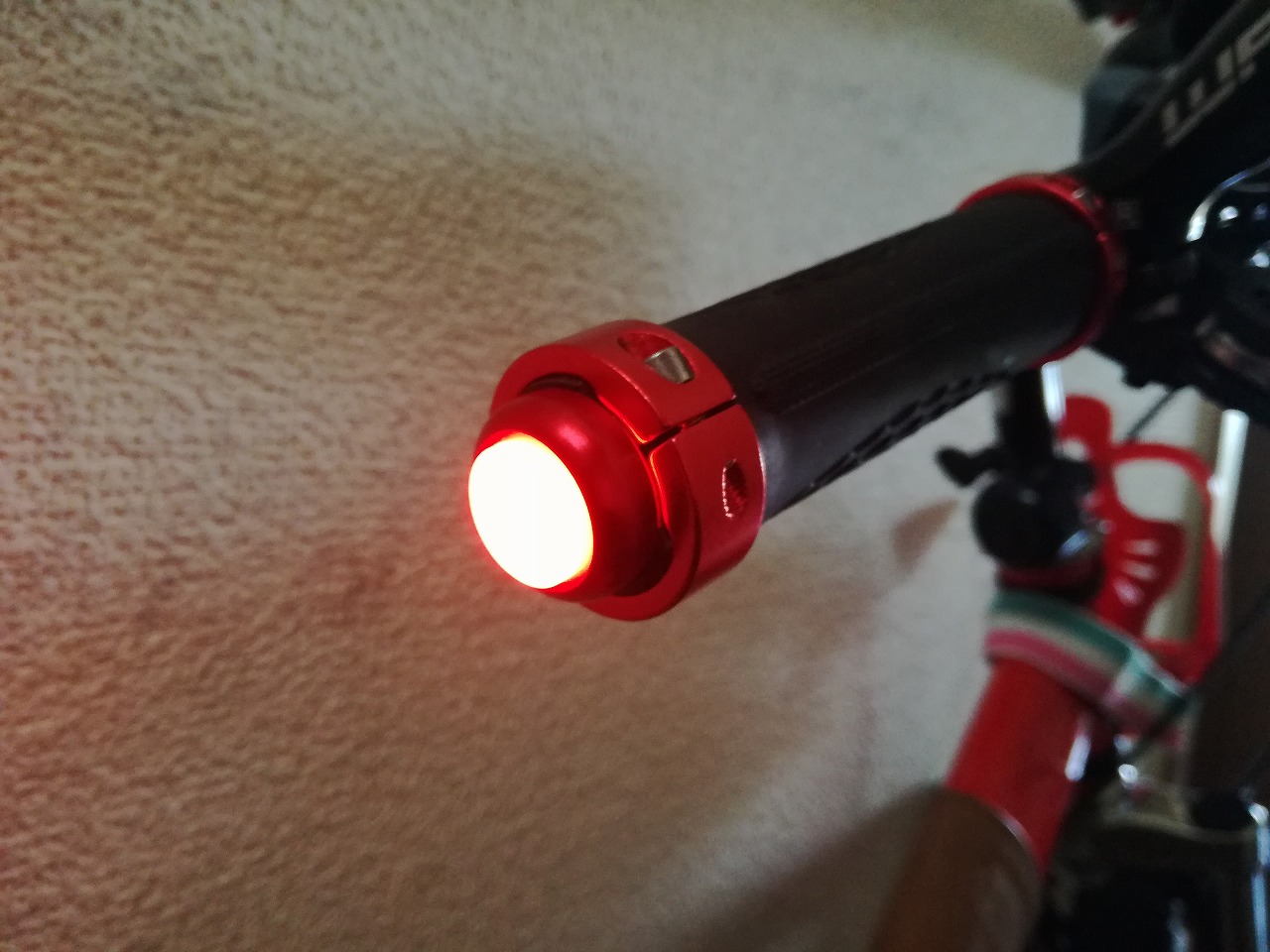 ハンドルバーエンドのLEDランプ302円、惜しくもオレンジではなく赤の点滅