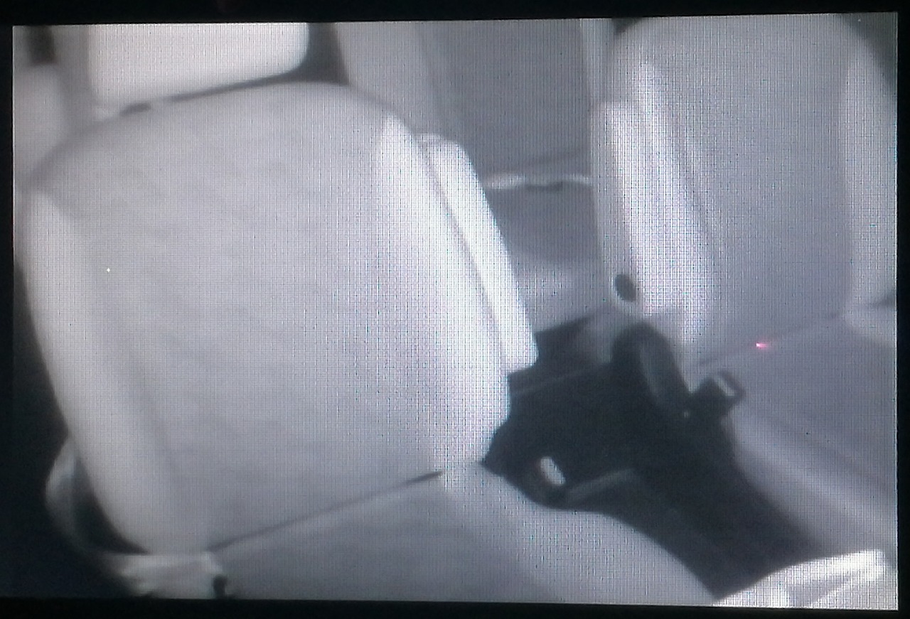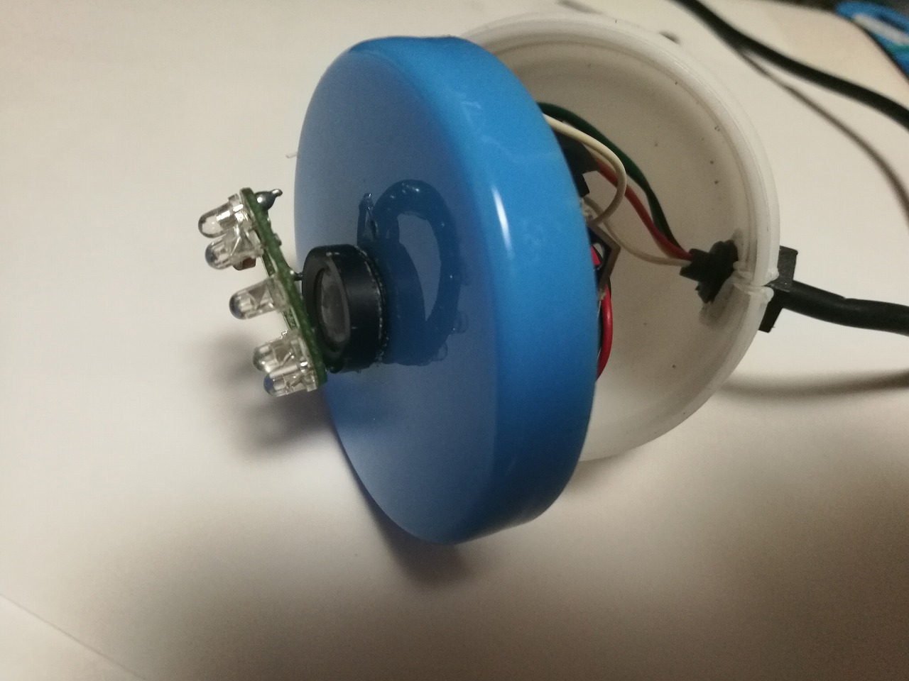 しばらく間に合わせで防犯カメラの中身だけ軟膏容器に入れて使ってたのですが防犯カメラだけに広角でサイドガラスの光や車がチラチラ目に入る、赤外線部分を外付けにしたので夜になるとレンズに光が入る、安物なので正像のみで鏡像に変更できない。