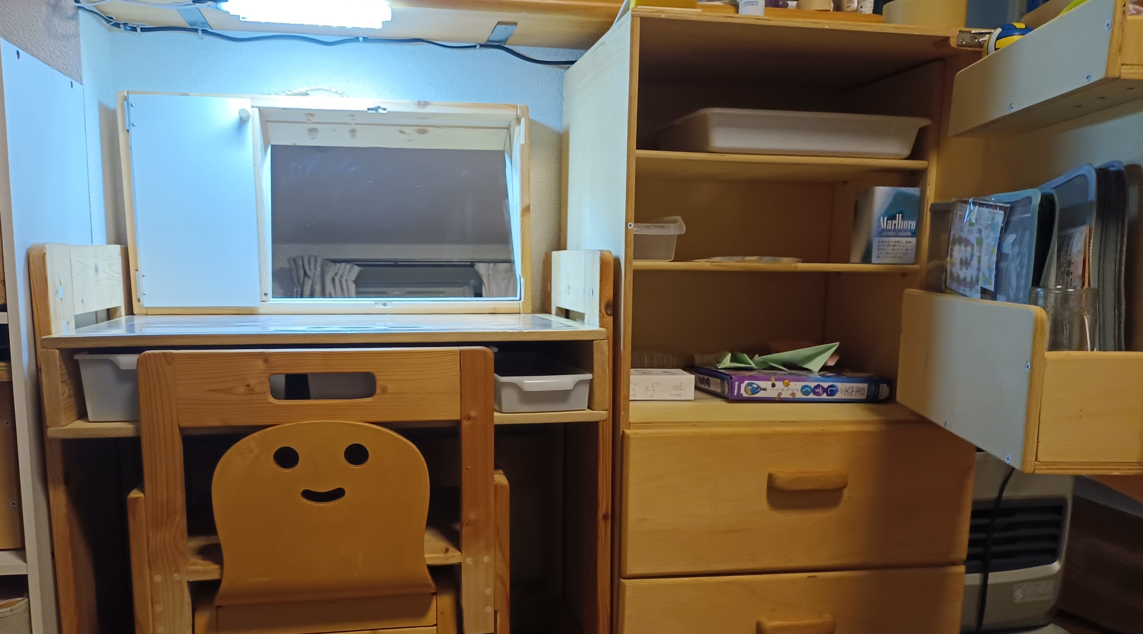 親の顔が見れてる方が落ち着くのではと逆バージョン(相互)も考えてましたがミラー型モニターが反射角度で子供から運転席の私の顔が見えてると言う一言で没となり、古いポータブルナビは運転席と助手席の間に取り付け現在のナビから映像出力でDVDの画像を映せるようにしました。