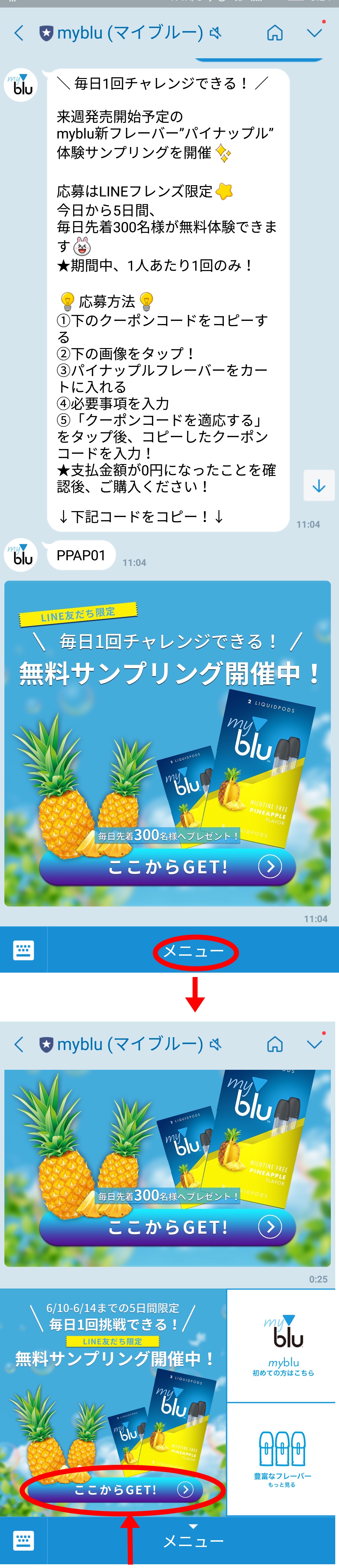 myblu パイナップルフレーバー LINEフレンズ限定 毎日先着300名様 無料体験 vape 2019年06月13日 2019年6月12日AM11時過ぎにメールが入りました。 別に必要も無いが前回登録してそのままだったのだが今回のメール内容は無料の文字が、 LINEフレンド限定企画、おともだち追加で・・・・ 毎日ここからGETでクーポンコードを出さなければいけないらしい。 0時過ぎに前のコードではじかれてからここに気付いたが既に遅し! 1日目クーポンコード PPAP01 2日目クーポンコード PINE21 ほんとに運です。 起きてて損しました。 抽選にしてくれたら当たる可能性もあるんですがタイミングのみというのは PCから応募する場合買い物かごに残したままにしておけばお忘れでは?メールが来るのでリンクから開く。 買い物かごが空になってたらまずはログイン状態にしてメールのリンクから行くとパイナップルが買い物かごに入った状態で出てきます。 LINEからのリンクでないとパイナップルにたどり着けません。 前回もでしたがmybluのサイト混んだらちゃんと反応しません。 0時過ぎたらパンク状態なので運なのです。 iqos 14日間無料レンタルプログラム進行中ーーーーーーーーーーーーーーー PR