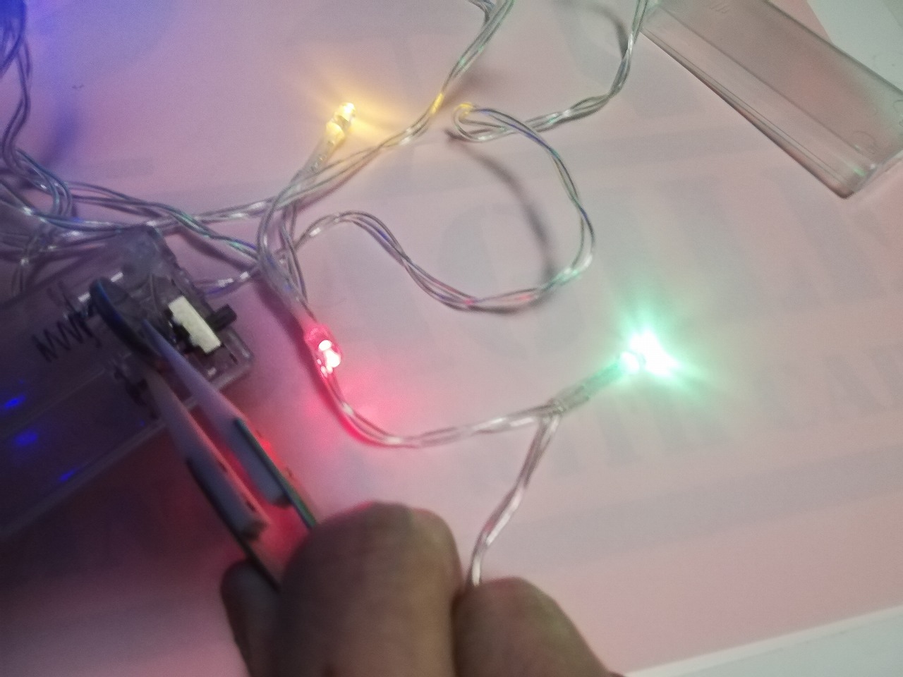 電池ボックス代わりになるLEDが付いていた物です。ON点滅、OFF消灯、今回は点灯なのでスイッチ部分と電池の所から線を引きます。