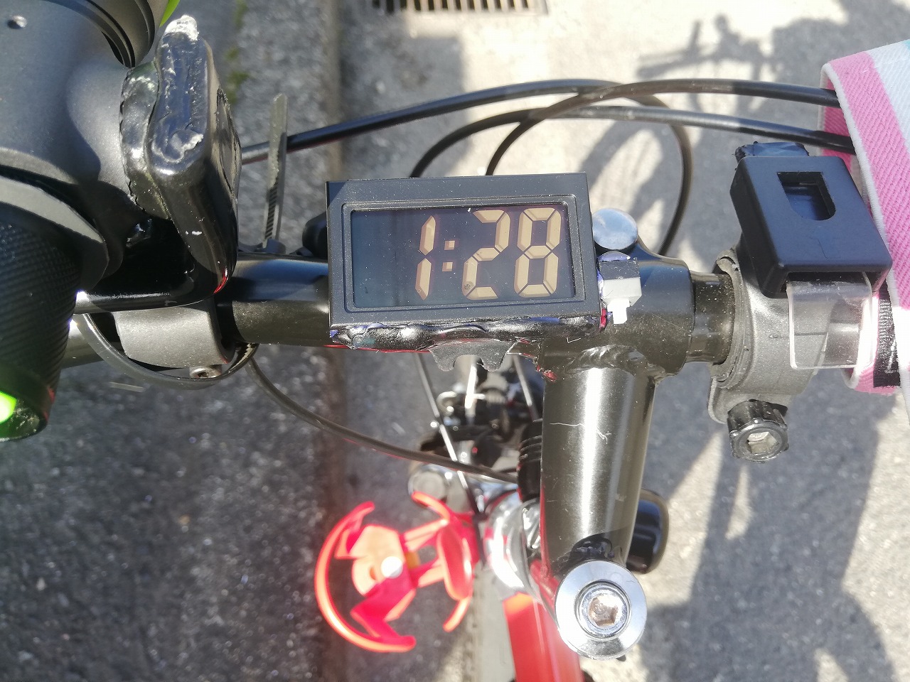 そして、時計をハンドルの位置に取り付ける(まだ方法は考えていない)としてサドルにまたがると下方から見る感じになるのでLEDがまぶしい。