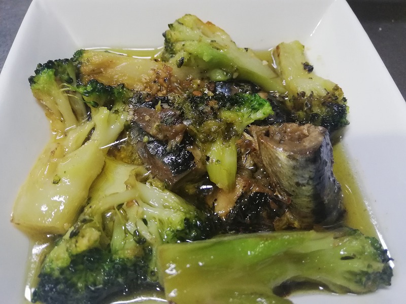 いわし水煮缶と冷凍ブロッコリーの(訳あって)唐辛子抜きアヒージョ(普通に入れてOKです。)